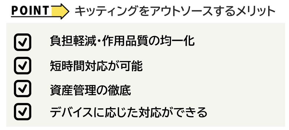 キッティングをアウトソーシングするメリットは、以下の通りです。自社で行うメリットや課題を踏まえて、メリットが多い場合にはアウトソーシングを積極的に活用しましょう。