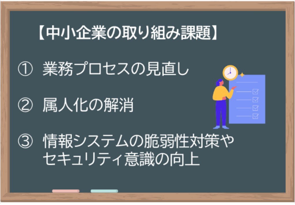 次に、「取り組み課題の明確化」を行います。アセスメントの結果を踏まえ、「経営・管理部門の仕組みをどう作り変えるか」「なぜ、その改革が必要か」などを協議し、自社が優先的に取り組む課題を定義します。中小企業が取り組むべき課題の例として、以下が挙げられます。