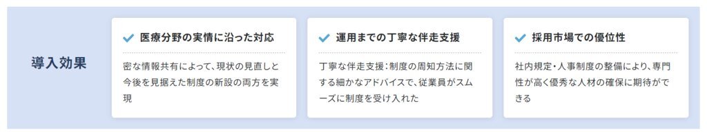 また同業界の中小企業の中で、人事評価制度の体制がしっかり整った企業が少ないため、人事評価制度の導入によって「競合他社に対する優位性」を確立できました。専門性の高い業界において、優秀な人材を獲得するための強みとなっています。