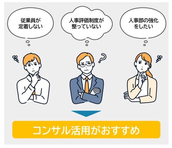人事評価制度の導入は、外部コンサルサービスの活用が有効です。「従業員の定着が安定していない」「従業員の評価制度が整っていない」「人事部の強化をしたいと考えている」企業にとって、最適な解決手段といえるでしょう。ノウハウを持つ専門のコンサルに依頼することで、法定対応や規程整備の導入支援を請けながら「自社に適した人事評価制度」を導入することが可能です。