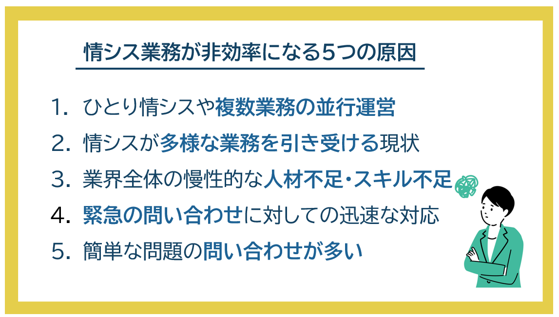 近年、ビジネスのIT化が進む中で、情シスの役割や重要性が増しています。その一方で、さまざまな理由によって「情シス業務が非効率な状態」に陥っている企業は少なくありません。原因として、以下5つの理由が挙げられます。
