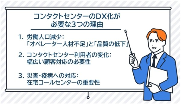 DX(デジタルトランスフォーメーション)は業務プロセスと顧客対応のデジタル化により、顧客満足度とオペレーターの業務効率を同時に向上させる取り組みです。コンタクトセンター業界を取り巻く環境を踏まえ、いまDXを推進しなければならない理由は以下の通りです。