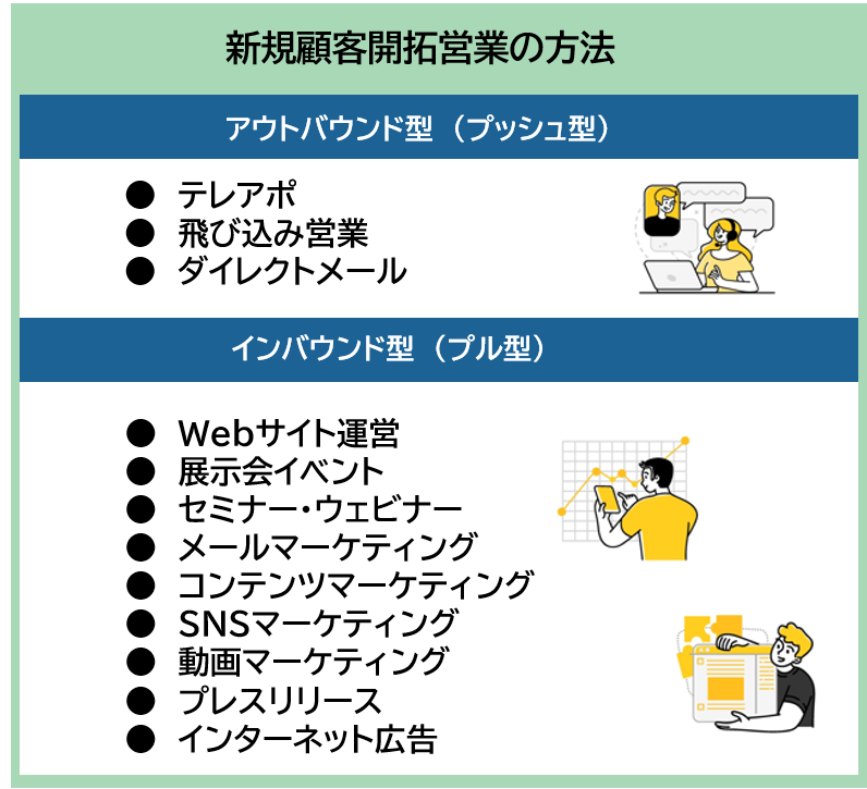 新規顧客開拓方法は大きく分けて、アウトバウンド型(プッシュ型)とインバウンド型(プル型)の2つあります。