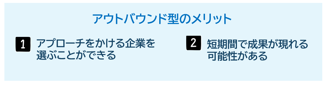 アウトバウンド型とは、こちらからアプローチするタイプの営業手法です。「テレアポ」や「飛び込み営業」など、企業を探し、アポイントを取り、商談をすすめていくという昔から取り組まれてきたオーソドックスな営業になります。入念なリサーチを実施すれば、契約してくれそうな企業に的を絞って営業活動をすることもできます。