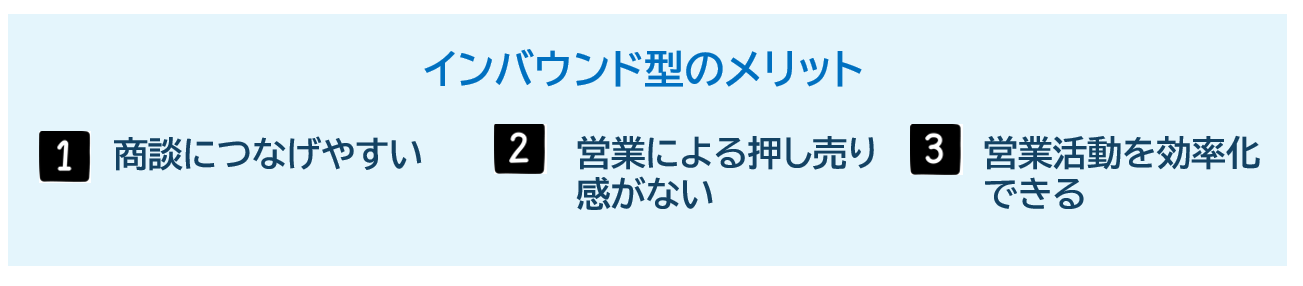 インバウンド型は、顧客から自社・商品・サービスの存在を見つけてもらう営業手法です。「WEBサイト」や「プレスリリース」などがそれにあたります。