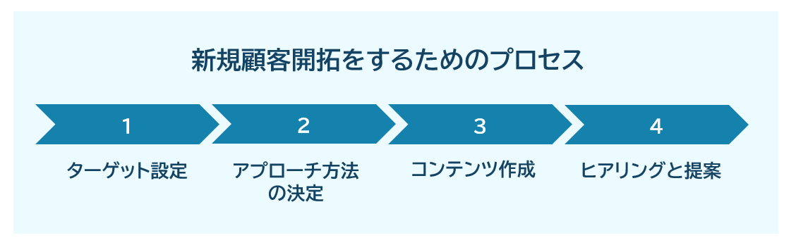 ではここで、新規顧客を開拓するためのプロセスを、デジタルマーケティングを前提に解説します。まずは大まかな4つのプロセスを知り、新規顧客開拓に必要な流れを知りましょう。