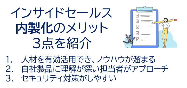 非対面の顧客に対して、「チームで効率的な営業活動」が可能なインサイドセールスは、いまの時代に即した営業手法です。内製化し、自社人材を有効活用することで、長期的な売上が見込めるでしょう。