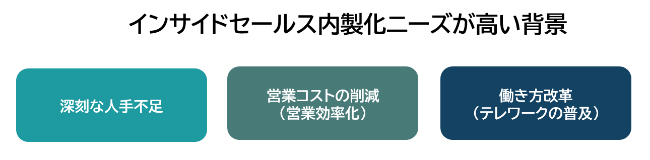営業活動はスキルやノウハウが属人化しやすく、人によって成果が大きく異なるのが特徴です。近年はこの属人化を解消して、「チームとして戦力を底上げしたい」と考える企業が増えてきました。その解決策が、インサイドセールスの活用です。各企業が新たな営業スタイルを模索するなかで、自社人材を使ってインサイドセールスに取り組む企業が増えているのです。(参考記事:インサイドセールスの事例5選から学ぶ成功の秘訣とは?)