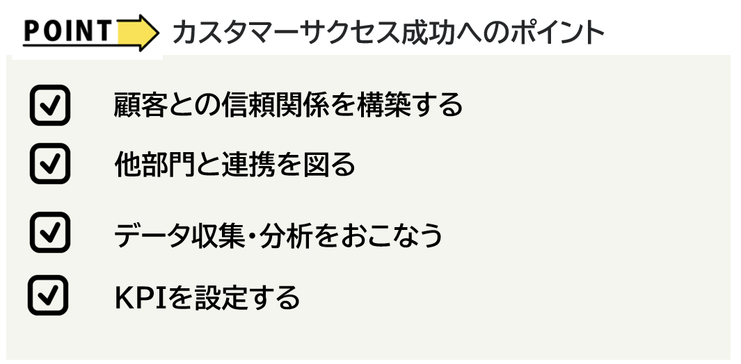 カスタマーサクセスを成功させるためには以下のポイントが重要です。