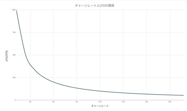 SaaSビジネスでは解約のことをチャーン、解約率のことをチャーンレートと呼びます。このチャーンやチャーンレートはSaaSビジネスの収益に直結しますので、収益安定化のためにもこれらをサービスの評価軸として重要視します。以下は、チャーンレートとLTVの関係を表したグラフです。