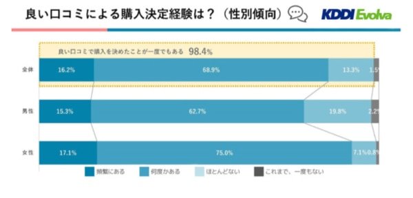 コミュニティタッチでのユーザー同士でのやりとりが、アップセルやクロスセルの機会へと繋がる場合もあります。コミュニティ内でのやり取りに、お互いの利害関係がないからこそ信頼度が増し、アップグレードやオプション購入などの購買行動につながるというケースも考えられます。株式会社KDDIエボルバがおこなった「EC・通販ユーザー動向調査レポート2021」では、良い口コミによる購入決定経験が一度でもある人は全体の98.4%と高い比率でした。