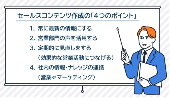 セールスコンテンツは、営業担当者が得た顧客からの意見や声などを参考に作成します。次に、具体的なセールスコンテンツを制作する方法やポイントを順に解説します。