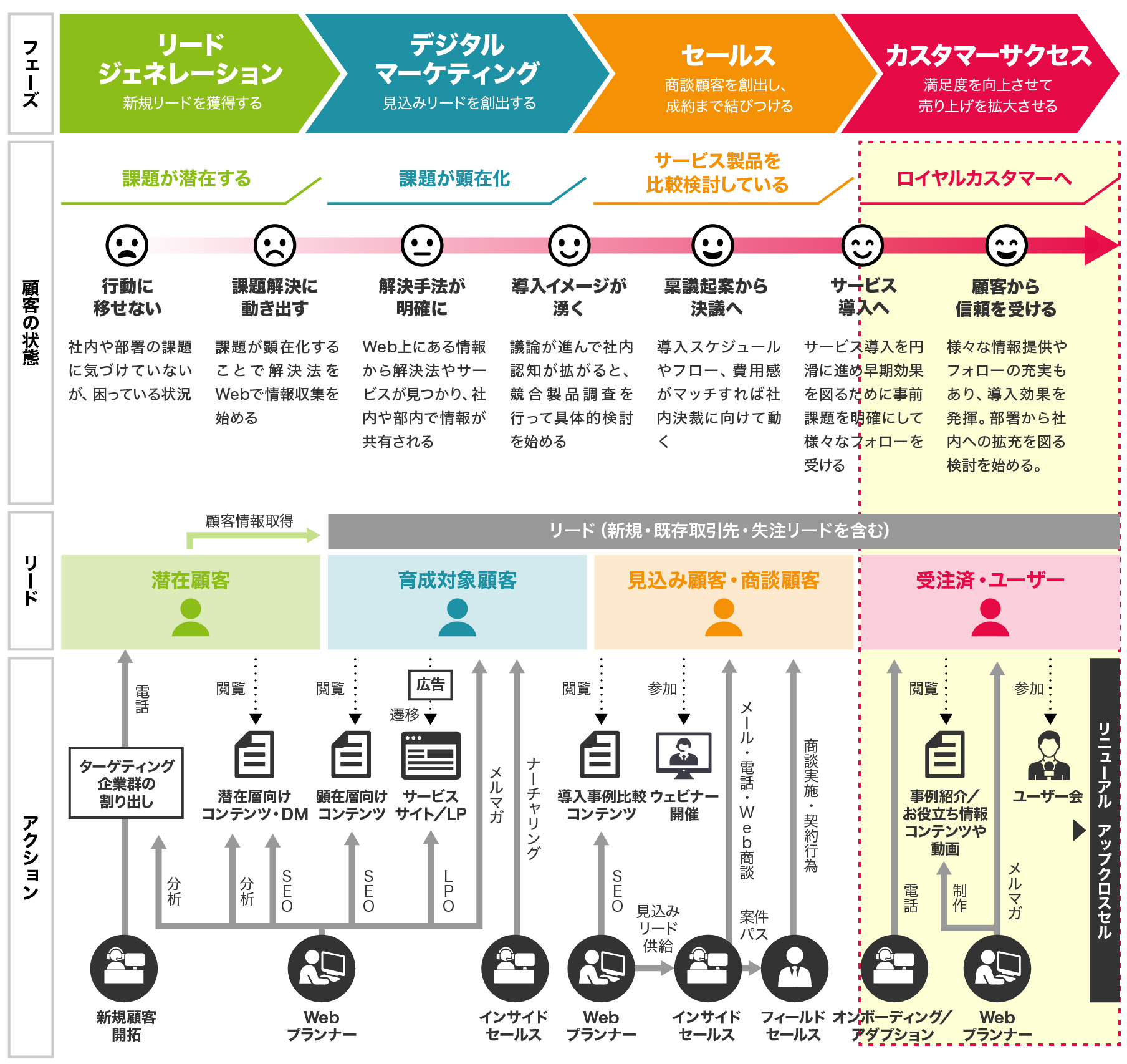 顧客の動向を常にトラッキングし、顧客の興味関心を把握します。タイムリーな情報提供や必要なフォローをおこなうことで利用促進をおこなったり、解約の予兆を察知することでや継続利用交渉を早いタイミングでおこなうことができます。